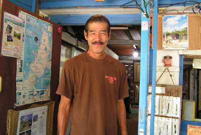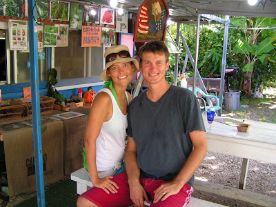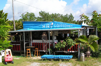 After packing up camp at the Higashi Beach (& getting a friendly American 4-wheel vehicle driver to pull us out of the sand), we continued north along the east coast on Hwy 70. Our first stop was at Hiro's Coffee, an awesome little coffee farm (we aren't the only ones that think so), where we had some delicious fresh brewed organic hot coffee. As we waited for the beverages, we were entertained by the free ranging chickens (were 1 or both roosters?). The very friendly owner struck up a conversation with us & graciously agreed to appear in our photo collection! It was so yummy & delightful that we even purchased a bag of dark roast beans (which we're currently enjoying using in our espresso maker), despite being natural penny-pinchers that too often end up supporting the coffers of the coffee giants.