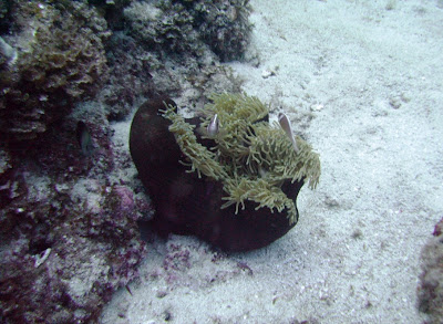 While Josh was inspecting a standalone anemone (feeding?) & its Pink Skunk Anemonefish inhabitants, Betsy pointed out the adjacent moray eel that was poking his head out of the rock he was hiding under (waiting to poach a meal, no doubt) right beside them: